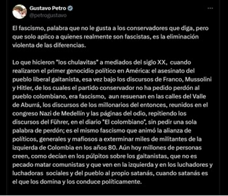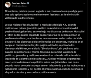 However, today we see how, in very different contexts, the term «fascist» is applied to any expression of radical right-wing, nationalist, or even conservative politics, often without an analysis of its social base or its relationship with capital. In Colombia, for example, within the sector of Petroism, the term has been abused to disqualify opposition sectors, including those representing traditional right-wing or far-right groups, such as Uribism. While these currents may assume authoritarian, repressive, or reactionary positions, they do not constitute a fascist project in the strict sense. President Gustavo Petro does not miss an opportunity to categorize his political opponents’ actions or proposals as Nazi or fascist indiscriminately. Comparing disparate events, he stated: “What the ‘chulavitas’ did in the mid-20th century, when they carried out the first political genocide in the Americas: the murder of the liberal Gaitánist people, that time under the speeches of Franco, Mussolini, and Hitler, for which the Conservative Party has not apologized to the Colombian people, was fascism,” asserted the head of state.