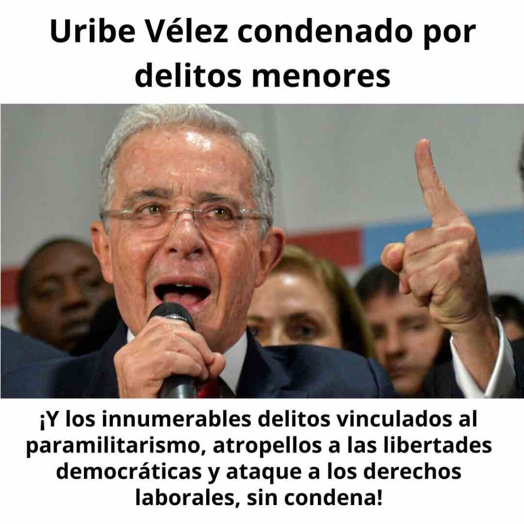 La condena en primera instancia del 28 de julio del año en curso, al ex presidente de Colombia Álvaro Uribe Vélez, a doce años de prisión domiciliaria por manipulación de testigos y fraude procesal constituye un hecho político muy importante. La sentencia lo responsabiliza de haber recurrido al engaño, ordenando a terceros dirigirse a personas encarceladas para que declararan a su favor, con el propósito de obstruir el curso de la justicia. Paradójicamente, se lo condena por los crímenes “menores” de su historial, en contraste con los innumerables delitos vinculados al paramilitarismo y atropellos a las libertades democráticas y derechos laborales cometidos durante sus ocho años de gobierno y la complicidad con los cuatro años de Iván Duque, cuando se perpetraron asesinatos, violaciones y encarcelamientos para sofocar el estallido social de 2021, hechos todos que siguen sumidos en la impunidad más vergonzosa.